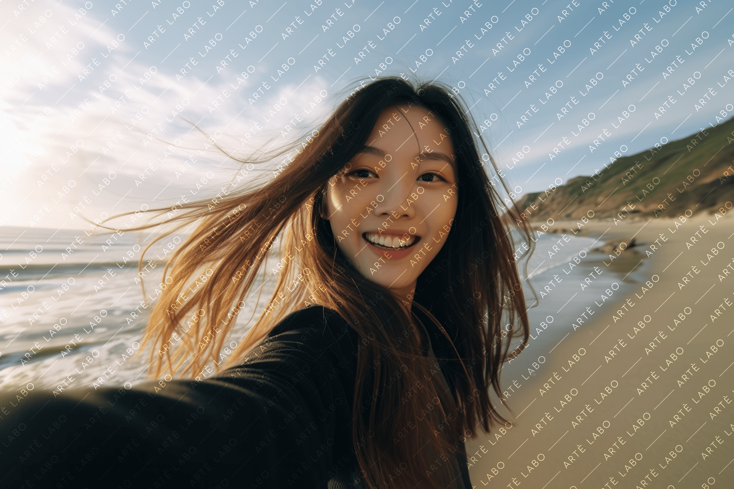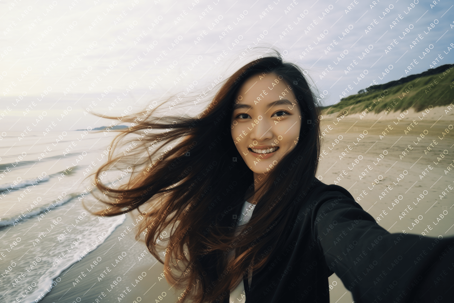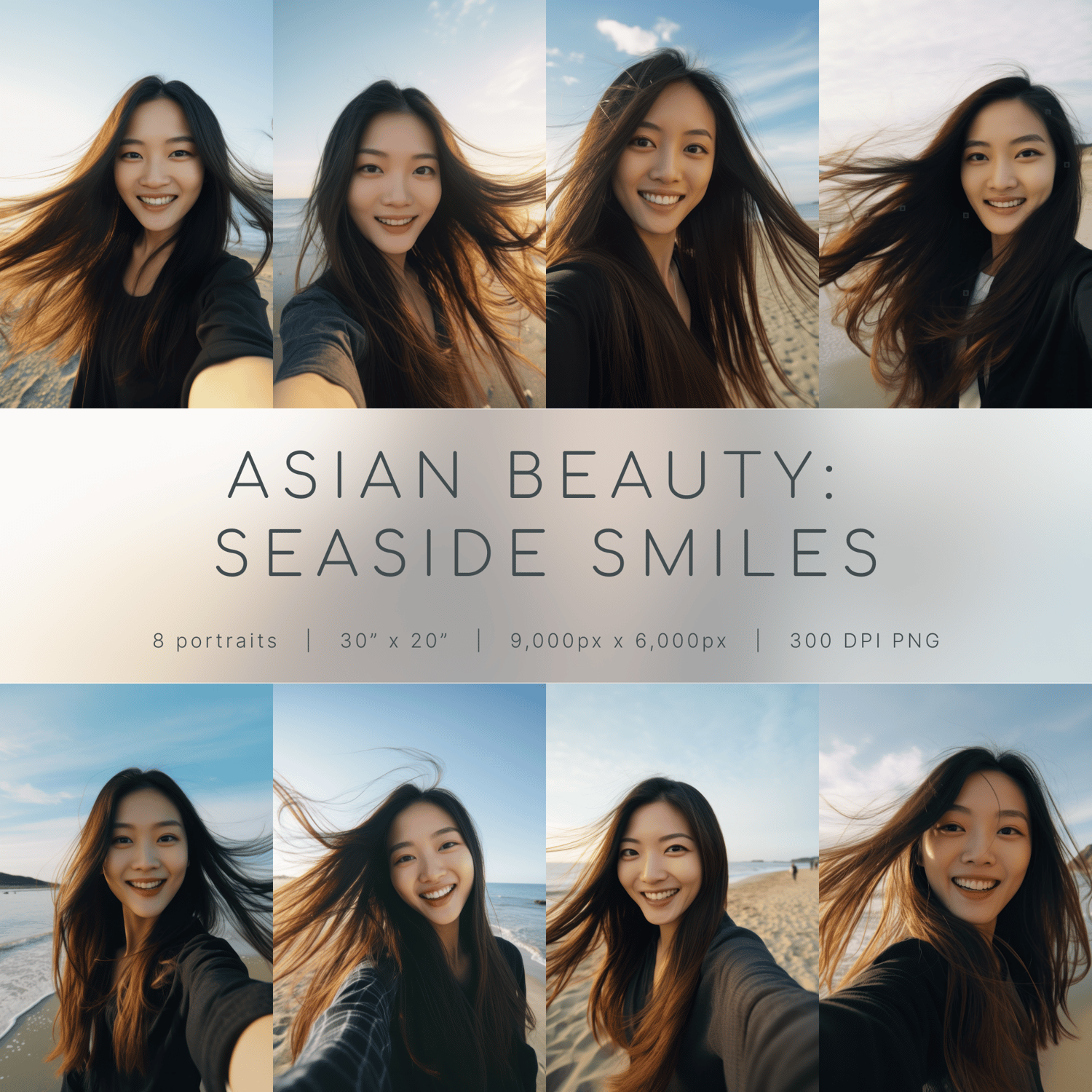 Introducing "Asian Beauty: Seaside Smiles Portrait Collection" - a heartfelt celebration of real people and genuine moments. Each product contains eight authentic portraits captured with care and attention to detail. Among them, you'll find a cheerful selfie of a slender Asian woman with straight hair, smiling radiantly at the beach.