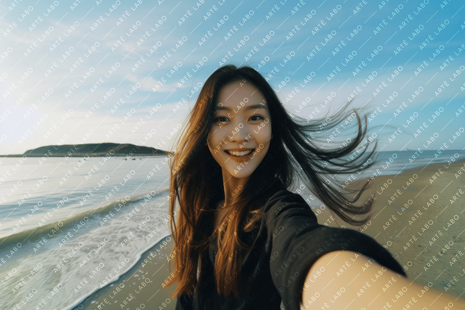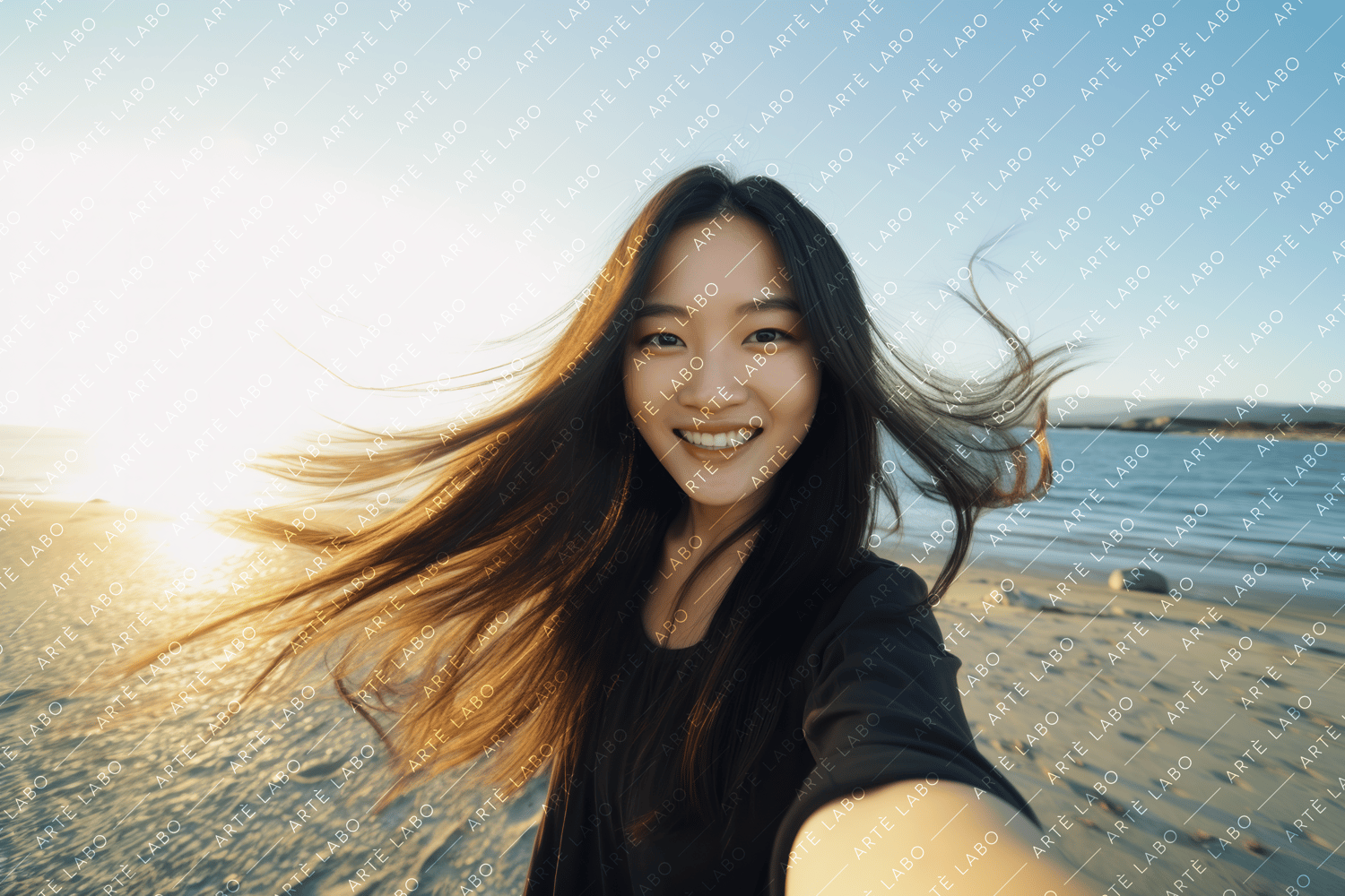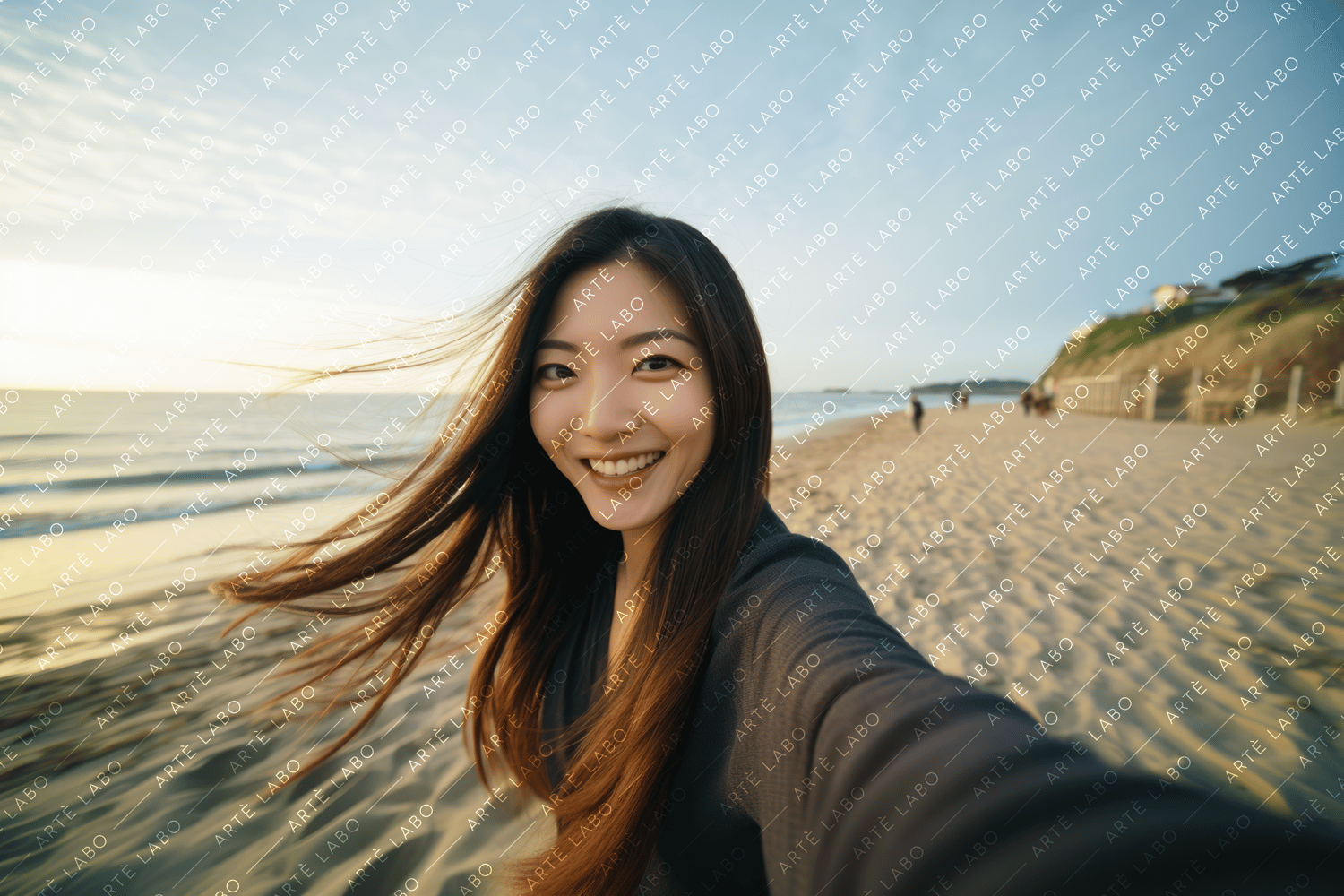 Introducing "Asian Beauty: Seaside Smiles Portrait Collection" - a heartfelt celebration of real people and genuine moments. Each product contains eight authentic portraits captured with care and attention to detail. Among them, you'll find a cheerful selfie of a slender Asian woman with straight hair, smiling radiantly at the beach.