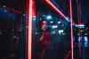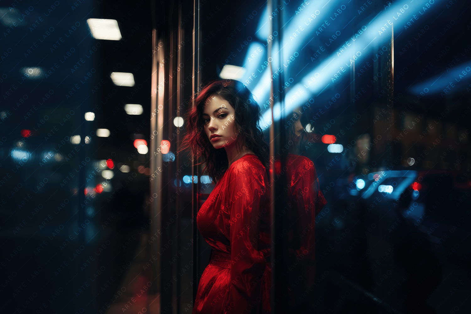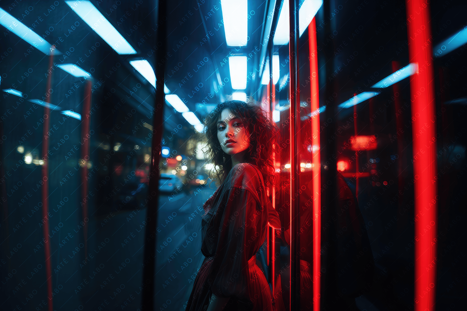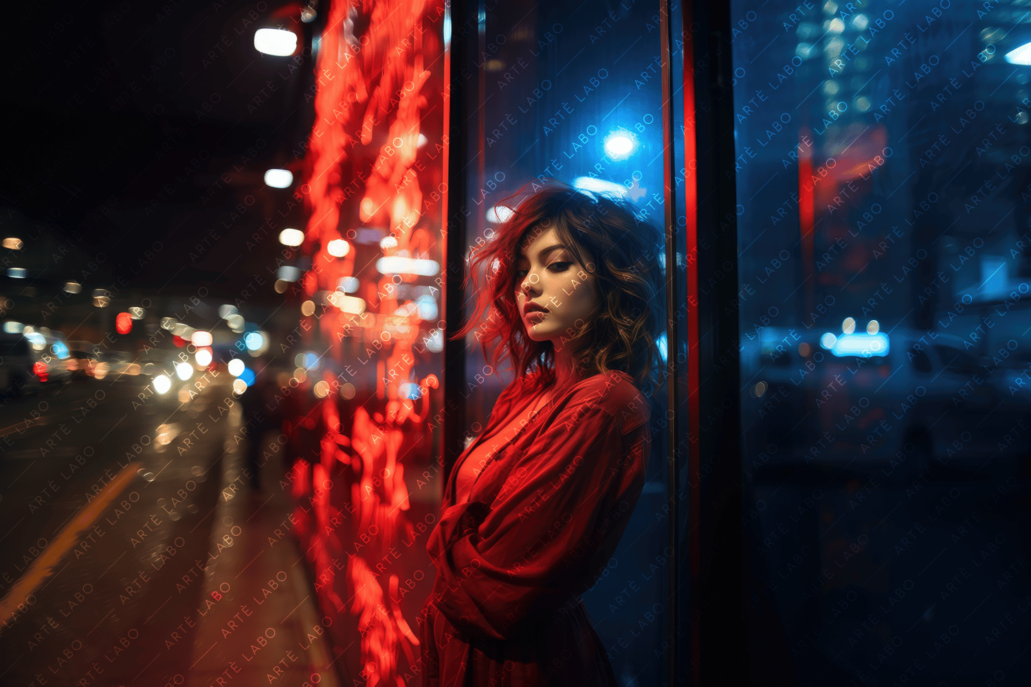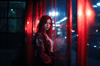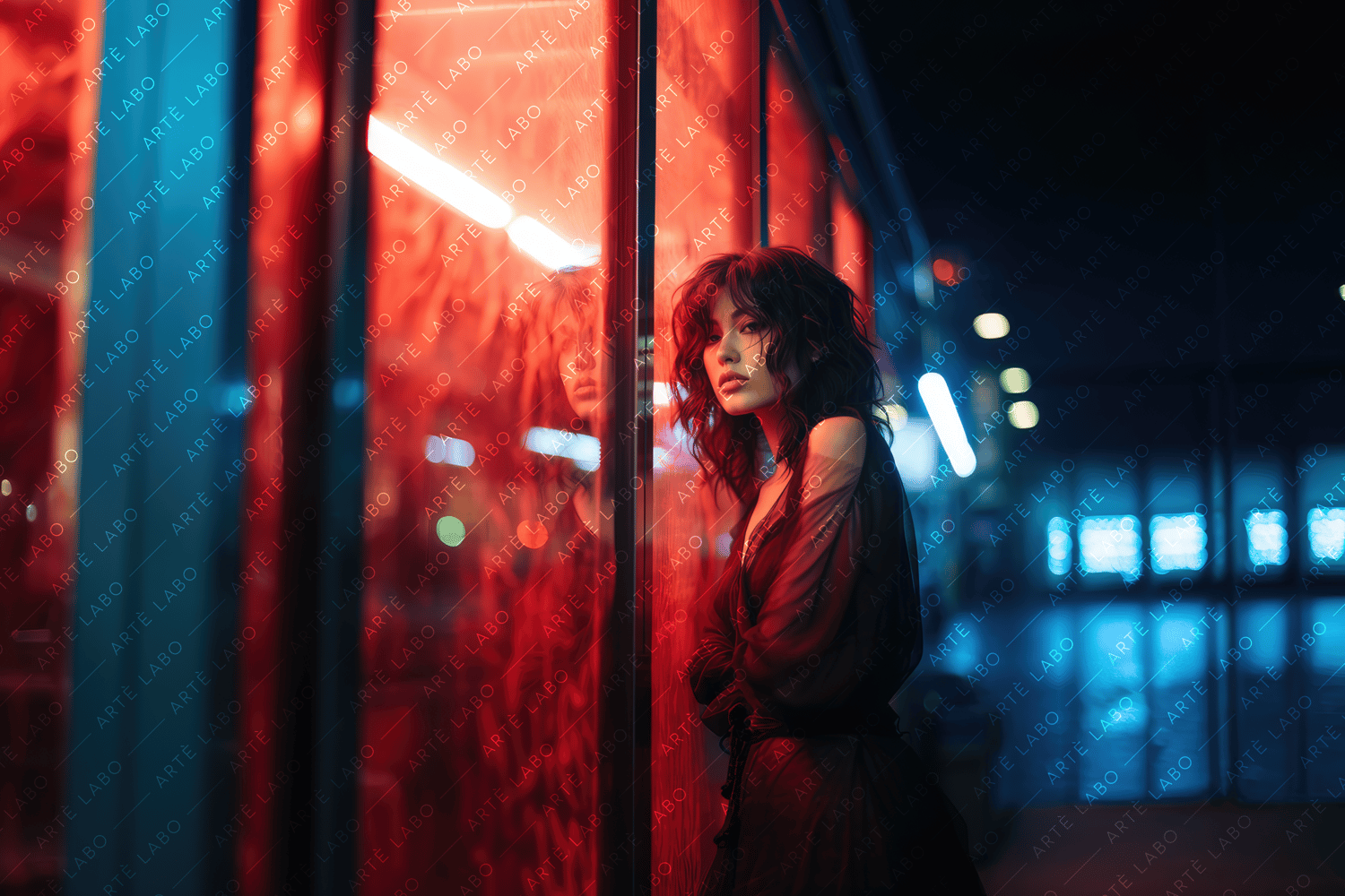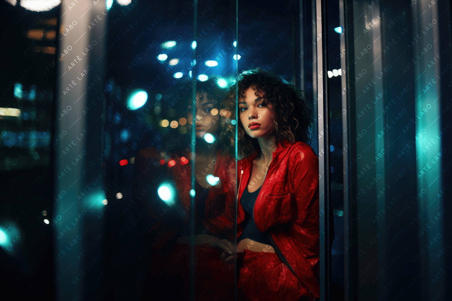 The featured portrait showcases the captivating contrast between the softness of the young woman's beauty and the vibrant neon glow that surrounds her. Against the glass window, her contemplative pose adds an air of mystery and intrigue to the composition.