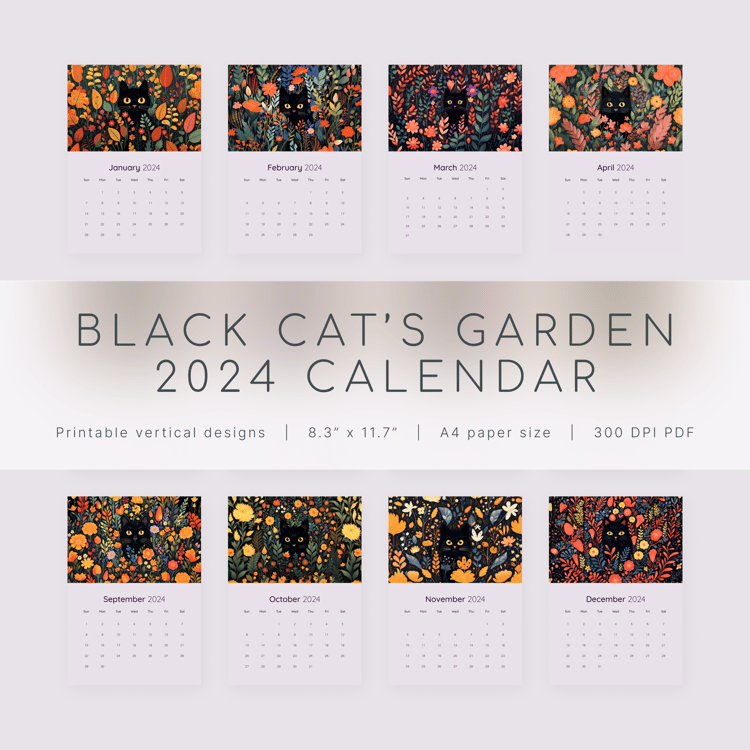 Black Cat’s Garden 2024 - Printable Vertical Calendar