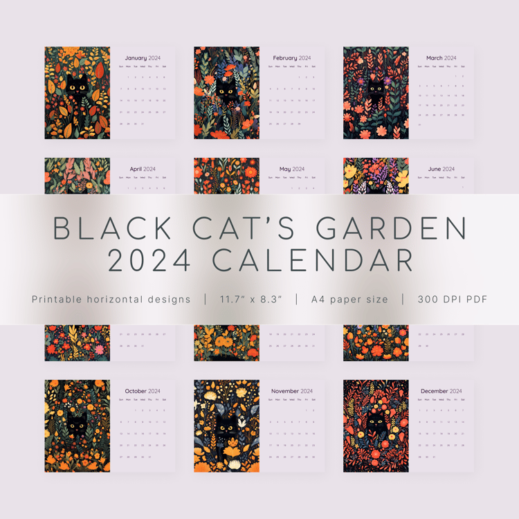 Black Cat’s Garden 2024 - Printable Horizontal Calendar